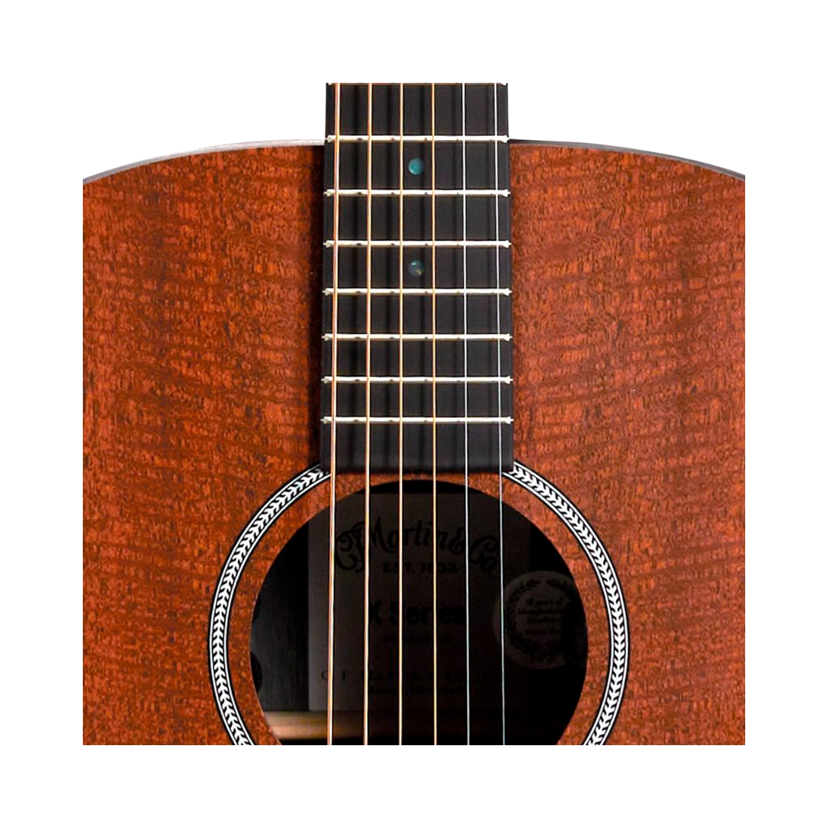 Estética Clásica de Caoba: El patrón de caoba en la tapa, aros y fondo de HPL (laminado de alta presión) le da un aspecto vintage y cálido, rindiendo homenaje a los diseños clásicos de Martin.