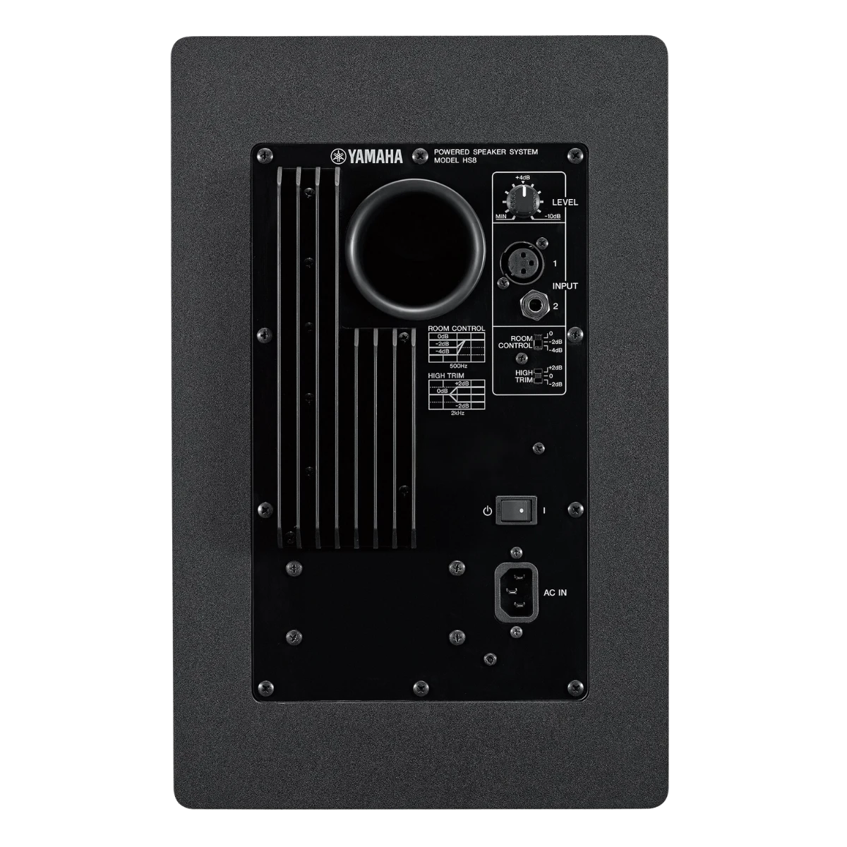 ROOM CONTROL Switch: Interruptor para atenuar las frecuencias graves (0/-2/-4 dB por debajo de 500 Hz), útil para compensar la colocación cerca de paredes.